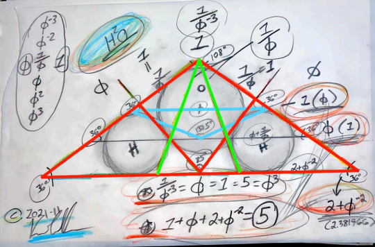The aqua lines below, in another layer of perfect harmonic incommensurability, of the water molecule exists at the axis of oxygen, and with base of 1, secondly at the axis of the hydrogen, and with base of Phi (1.618..), and lastly at base of the molecule with its base of 2 plus Phi-2 (life, or .381966), or in total 2.381966. Fascinating (not at all since this geometry is the only perfect geometry as declared by the ancient Pythagoreans and contains the water molecule itself), how the total of these harmonic sections of 1, Phi, and 2+Phi-2 = 5.